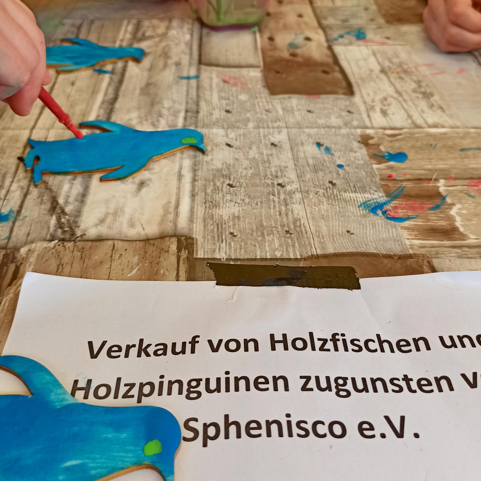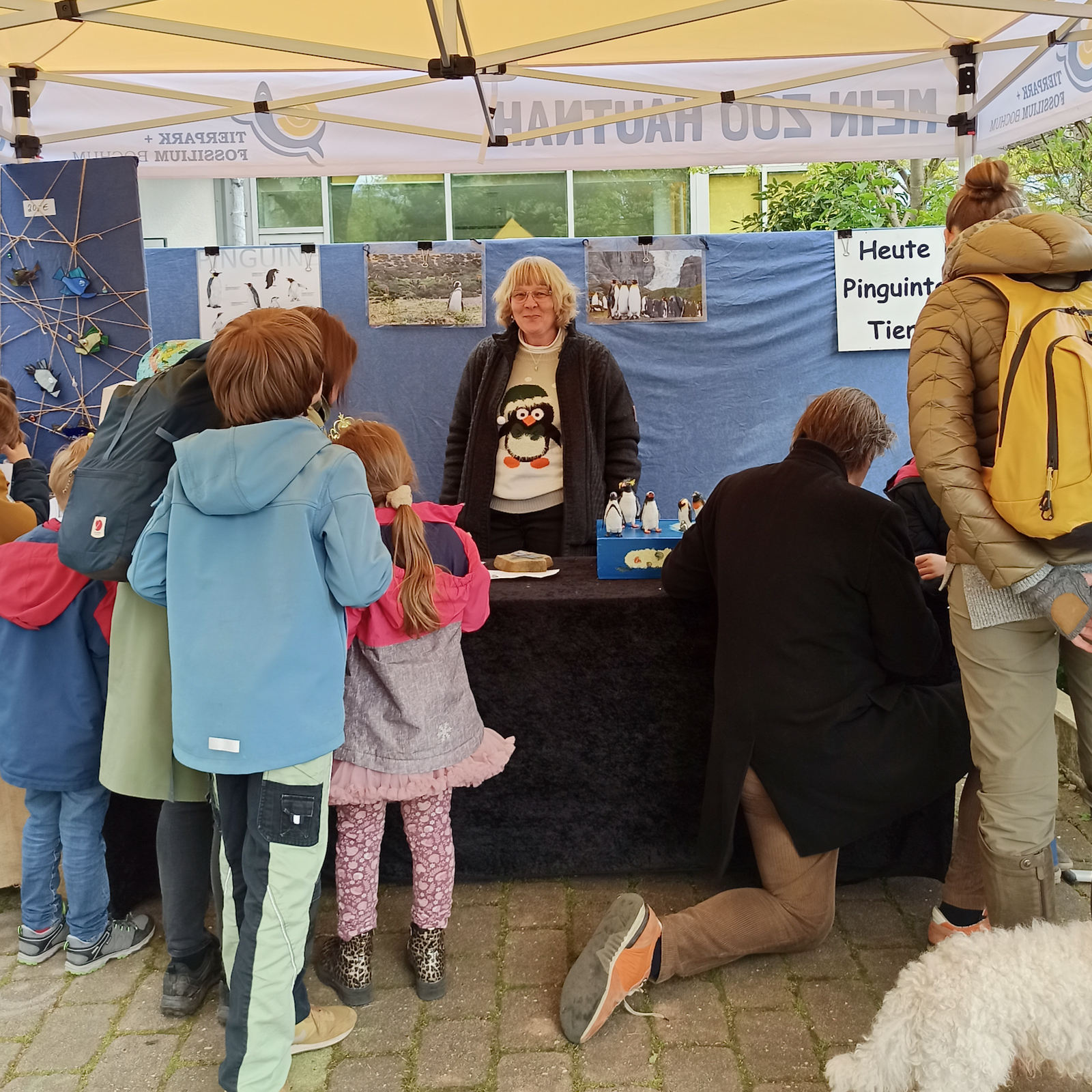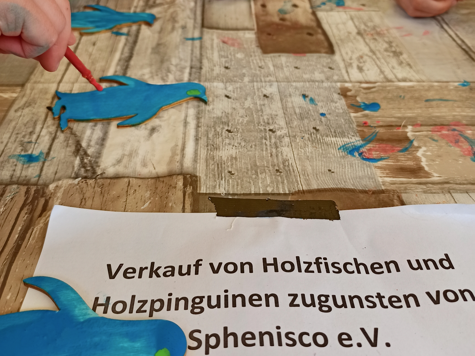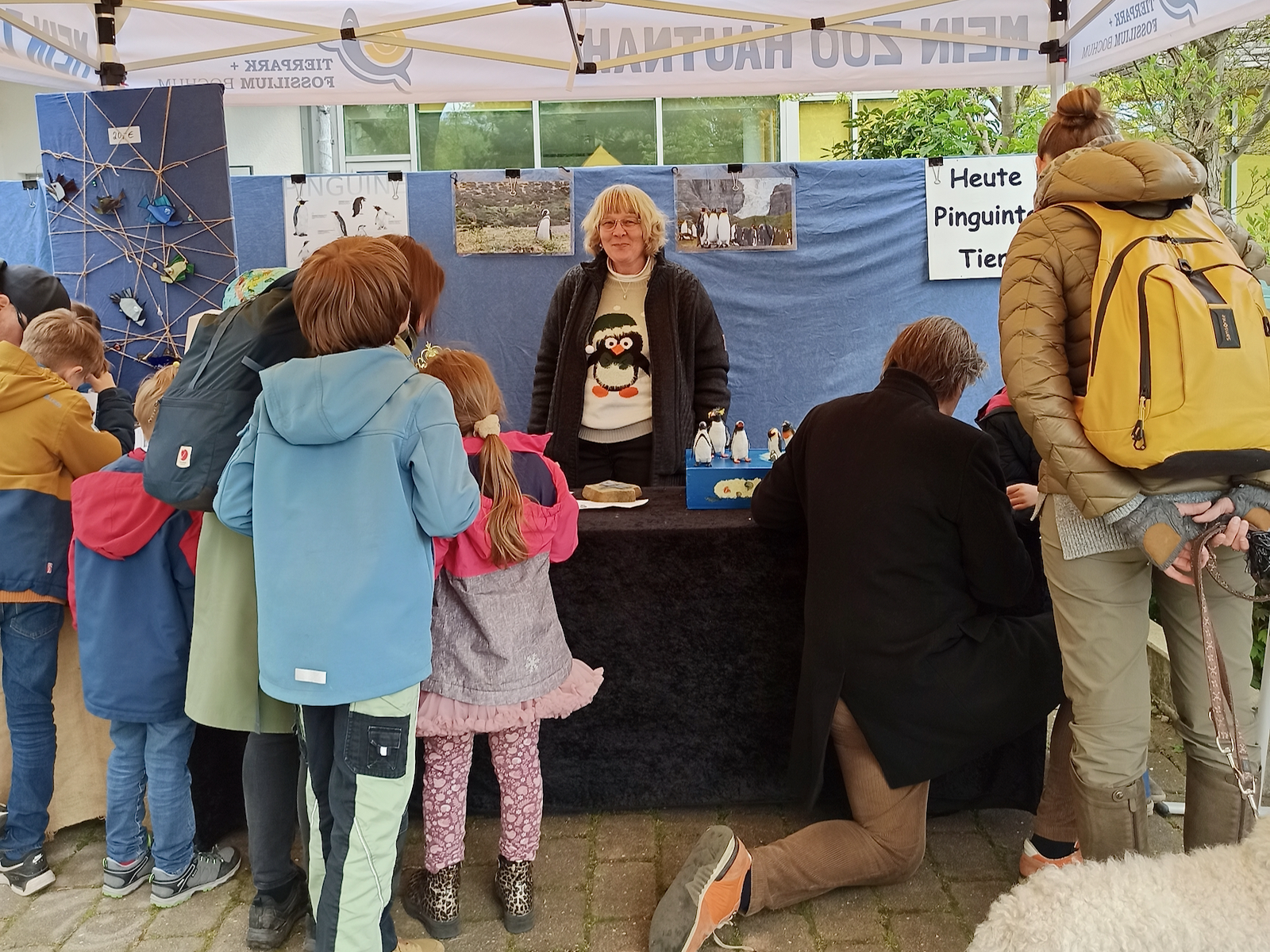 An vier Aktionsstände waren Humboldtpinguine das Thema. Am Infostand konnten Kinder bei Lernspielen viel über die außergewöhnlichen Vögel erfahren, dazu wurden Glasfiguren und Mosaike zugunsten von Sphenisco verkauft. Zwei Stände luden die kleinsten Besucher zum Malen und Basteln ein, Pinguine und Fische wurden bemalt, die Einnahmen an Sphenisco gespendet. Insgesamt kam die stolze Summe von 650,- € zusammen. Am zweiten Stand verwandelten sich Tannenzapfen in kleine Pinguinfiguren. Besonders beliebt war bei den Kleinsten der Pinguinparcour, der kindgerecht auf die menschengemachten Gefahren hinwies, die den Pinguinen im Meer und an Küsten drohen, wie Lebensraumverlust, Ölpest, Überfischung, Plastikmüll und Klimawandel. Eine Rallye zum Thema Pinguine rundete das Programm ab.“