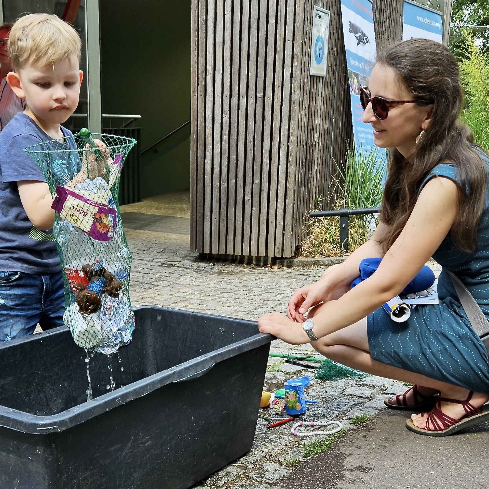 Ein weiterer Magnet für Kinder war eine als Meer umfunktionierte Plastikwanne, vollkommen verschmutzt mit Plastikmüll. Mit Keschern zeigten die kleinen Besucher enormen Einsatz als Umweltschützer. Ruck-Zuck war das Meer von all den großen und kleinen Plastikteilen vom Gummiring bis Quietscheente befreit, doch die vielen winzigen Mikroplastikpartikel blieben trotz aller Anstrengungen und machten das einst klare Wasser zu einer trüben Brühe. Welch eindrücklich-schockierendes Erlebnis!