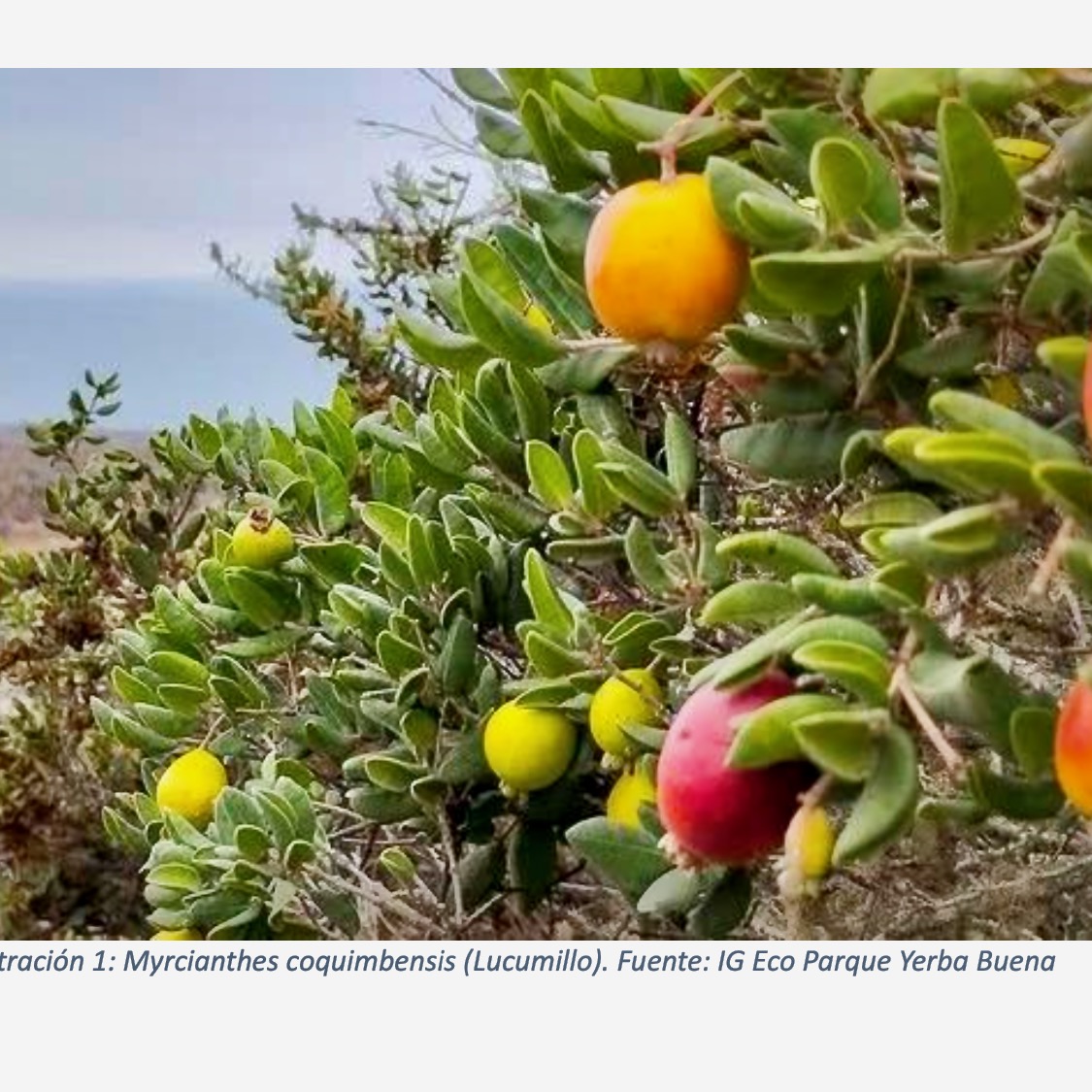 (2) Lucumillo (Myrcianthes coquimbensis). Este arbusto de hoja perenne es endémico de la costa de la provincia de Elqui, en la región de Coquimbo, está en peligro de extinción y produce un fruto comestible.