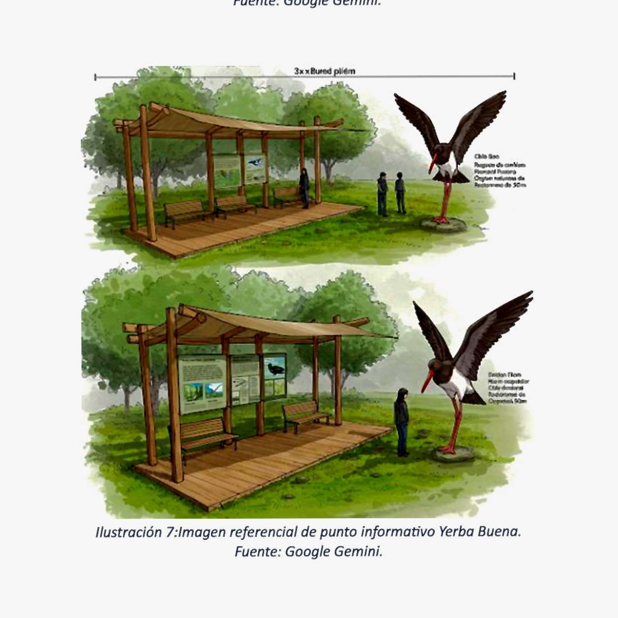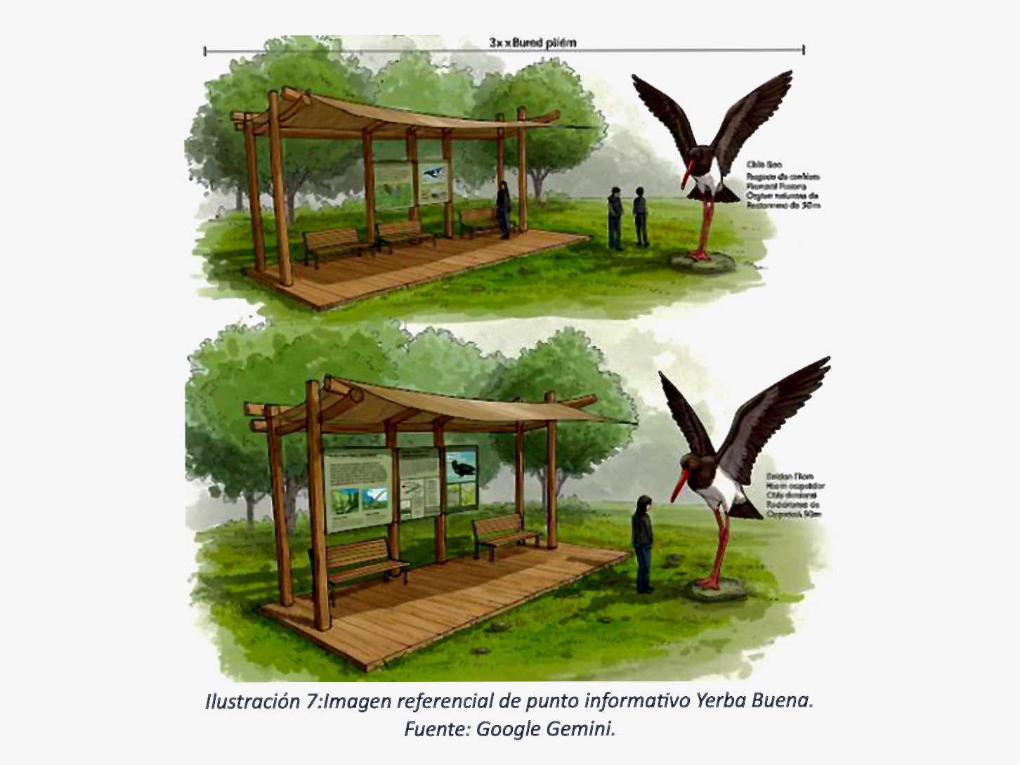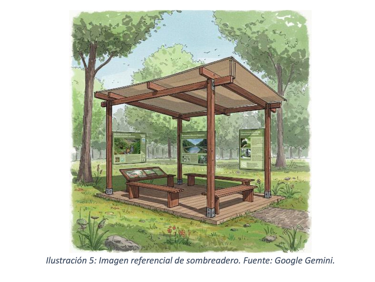 La escultura de tres metros de altura del Pilpilén con las alas extendidas será creada por Alexis Araya, un artista de la región, a partir de residuos reciclados (coches abandonados, especialmente parachoques de plástico). La escultura estará firmemente anclada al suelo con vigas de hierro y pintada con pintura de automóvil para preservar la calidad y durabilidad de los colores. Los cuatro carteles también serán resistentes a la humedad y a los rayos UV, de acuerdo con las condiciones ambientales. Se utilizarán placas de acero inoxidable grabadas en bajo relieve y pintadas. También se utilizarán materiales duraderos, resistentes al sol y a la humedad, para los asientos a la sombra. El toldo se compone de un tejido tensado resistente a los rayos UV y al agua, y está diseñado para permitir una buena ventilación. Se utilizan colores tierra y neutros para que los objetos se integren armoniosamente en el paisaje. Los asientos están colocados de tal forma que facilitan la interacción social y animan a contemplar el paisaje (véanse las imágenes del diseño).