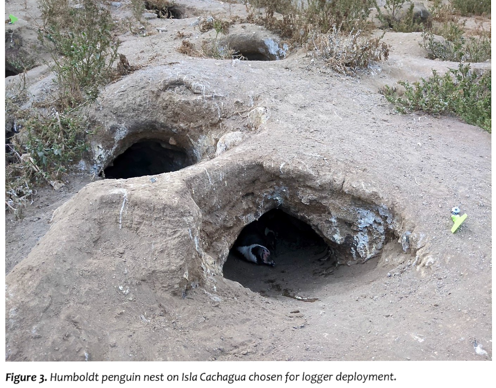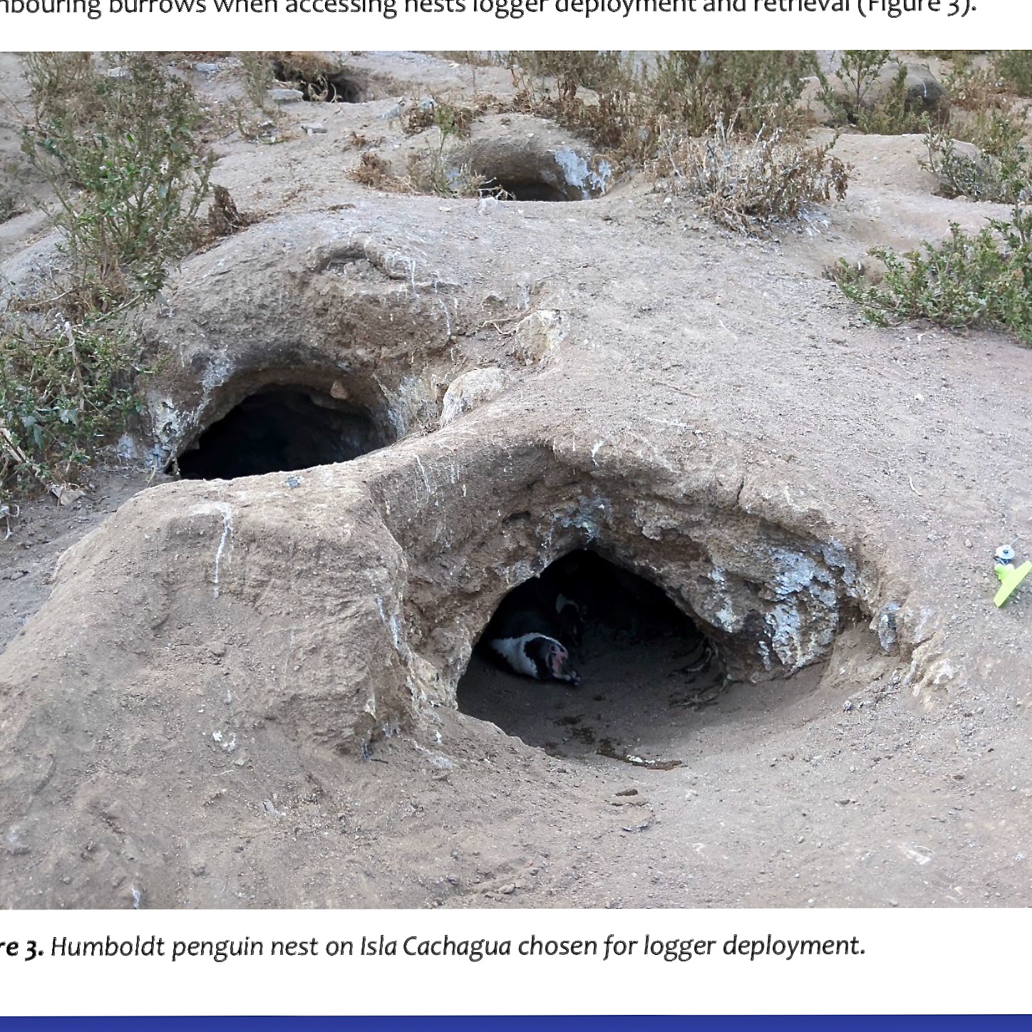 2. Los nidos de pingüinos de Cachagua se encontraban en su mayoría en frágiles madrigueras. Los nidos se seleccionaron en función de su facilidad de acceso, es decir, sin molestar en exceso a los pingüinos de los nidos vecinos, ni correr el riesgo de que los nidos se derrumbaran. Todas las aves seleccionadas para el uso de los registradores estaban gozando de buena salud y tenían polluelos sanos de entre una y cuatro semanas de edad.