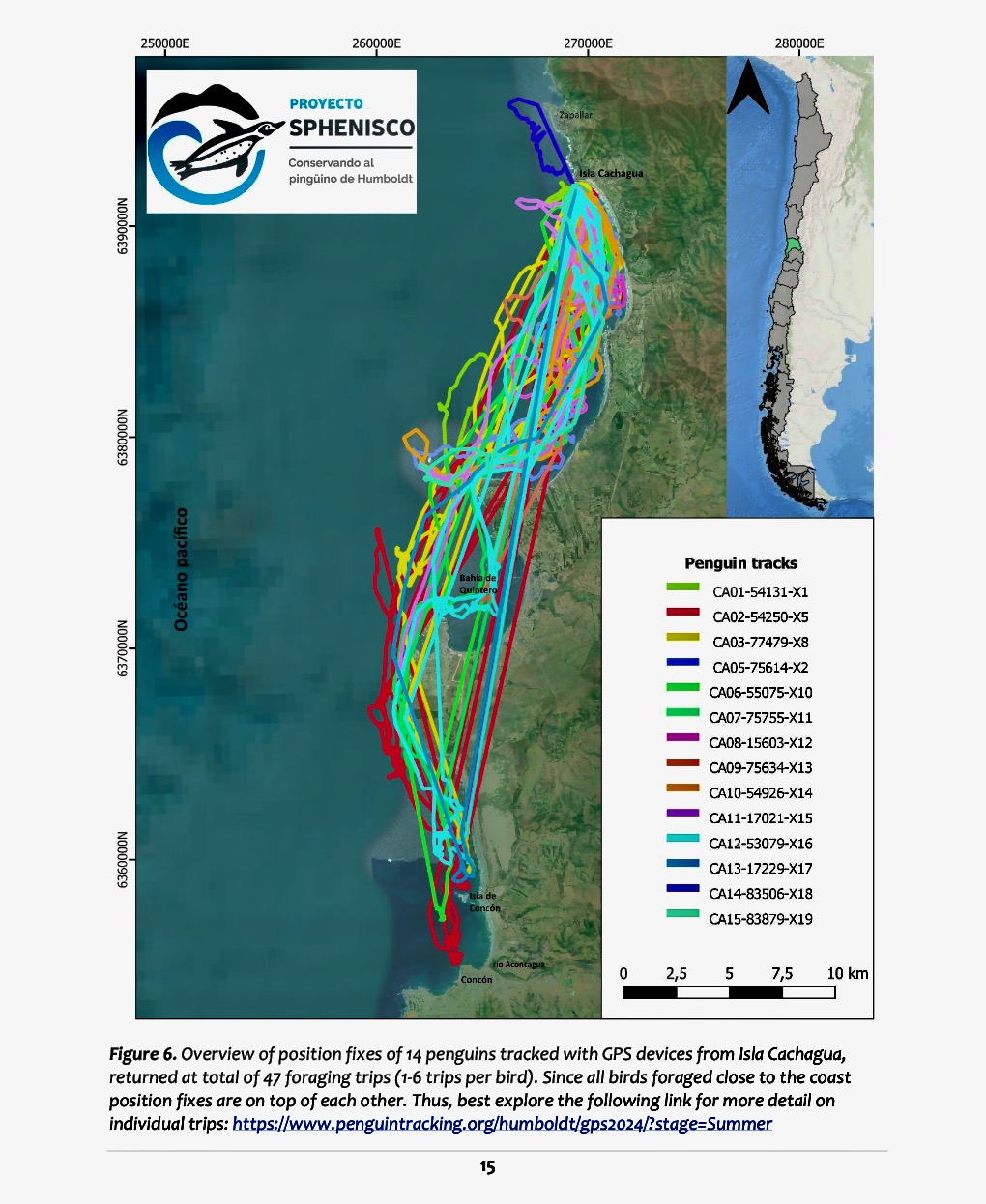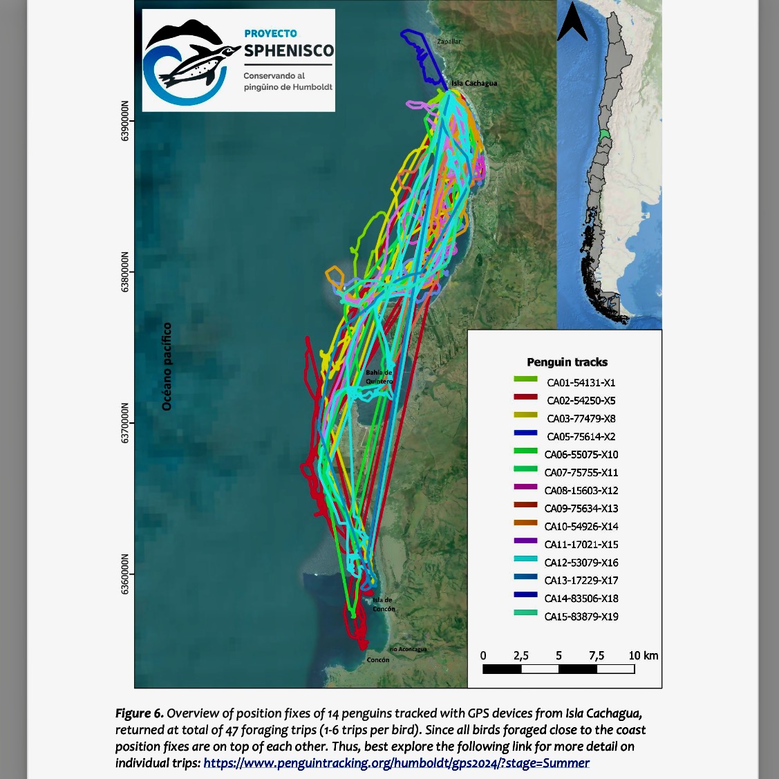 9. Con una única excepción, todas las aves buscaron alimento al sur de la isla de Cachagua y la mayoría de sus actividades se desarrollaron en un radio de 20 km en torno a la isla. Tres aves nadaron más allá del municipio de Quintero, una de ellas hasta el municipio de Concón, donde buscó alimento en la productiva zona de la desembocadura del río Aconcagua.