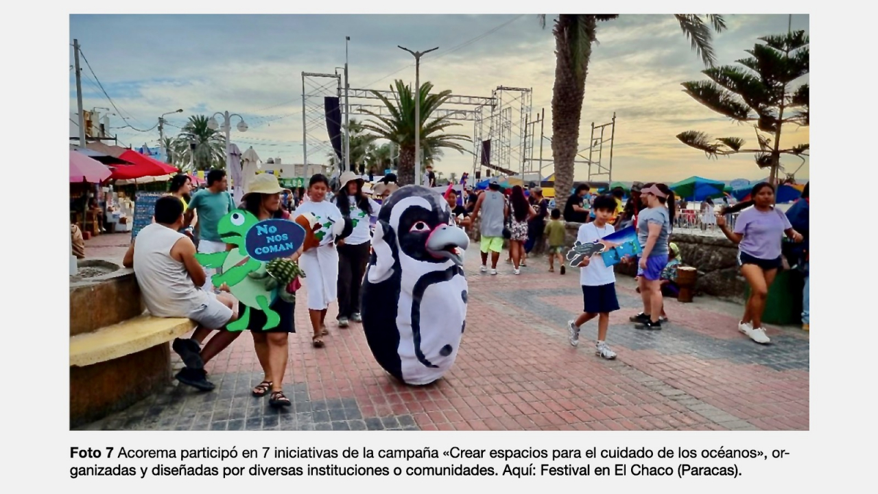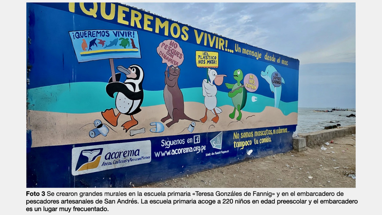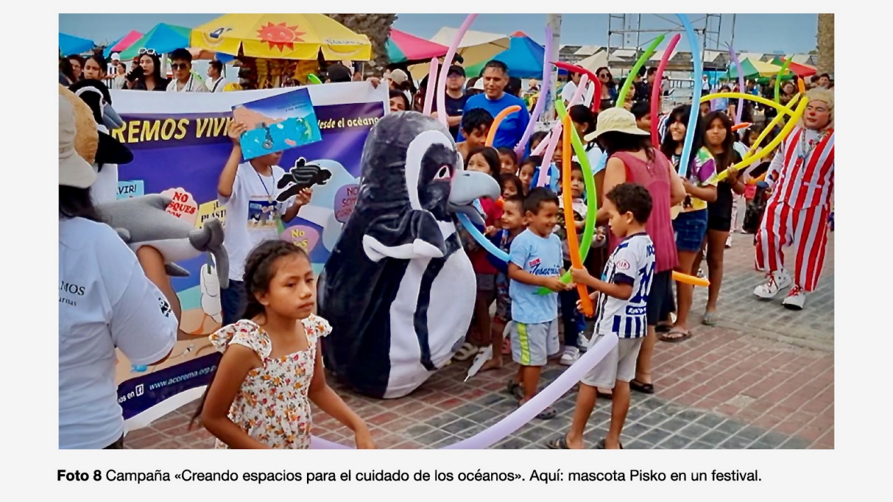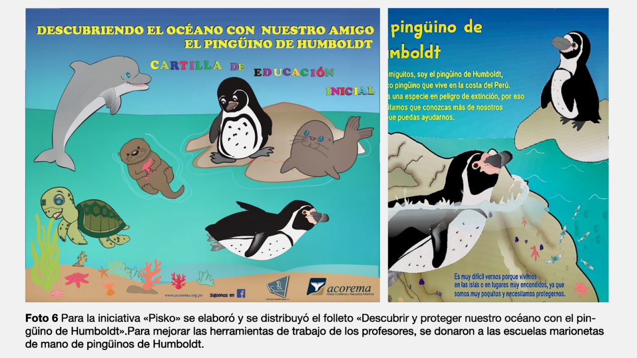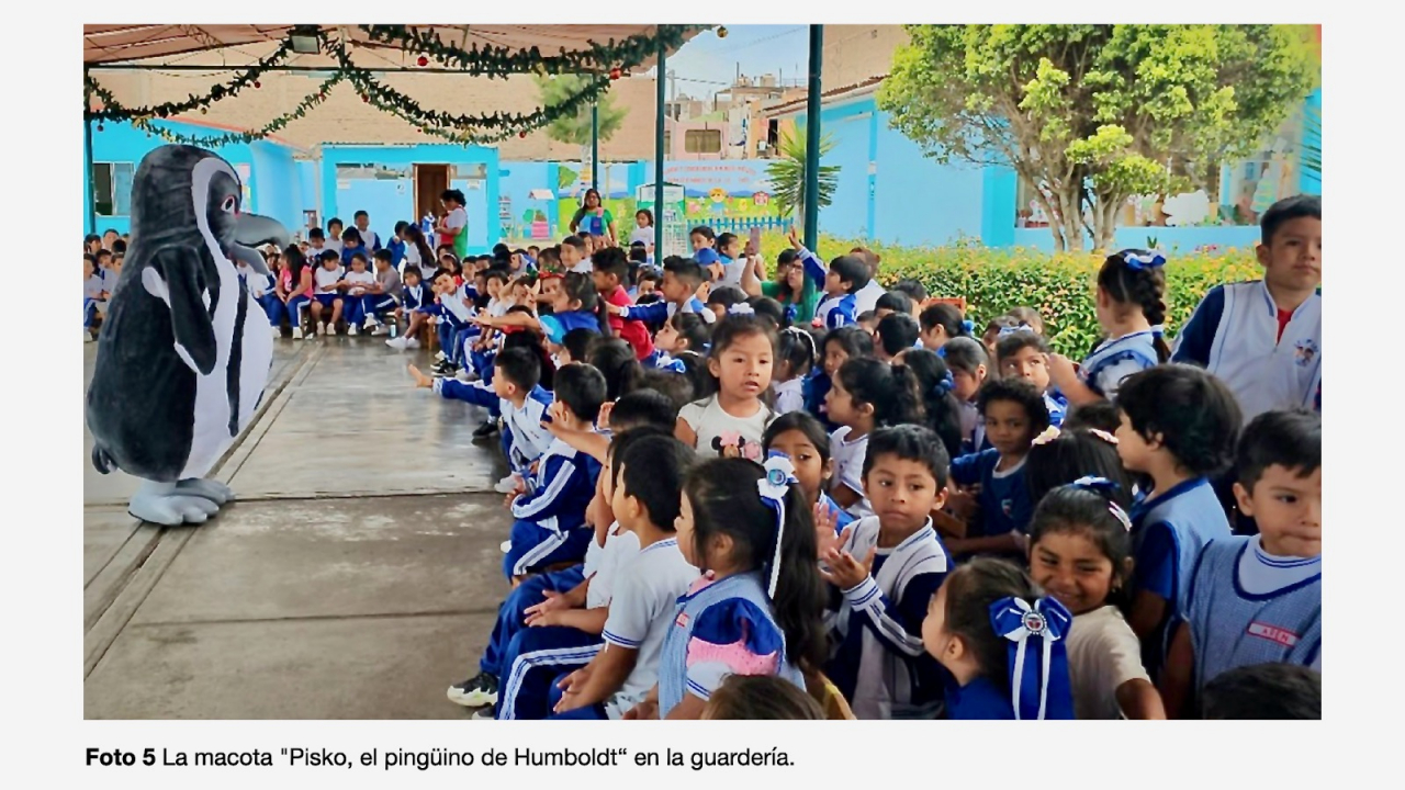 Echando la vista atrás a los comienzos, el presente informe también documenta la evolución del trabajo de Acorema. Entonces como ahora, la Sra. Milagros Ormeño B. y su equipo trabajan con gran profesionalidad y un nivel de compromiso personal inusualmente alto. Ayer como hoy, las pancartas, folletos y pegatinas se diseñan al «estilo Acorema». Los materiales, muy comprensibles y atractivos para los niños, se han convertido prácticamente en una marca registrada (Fig. 1 y Fig. 2). En los primeros años, el trabajo se limitaba a las escuelas de la zona de Pisco-Paracas. Entretanto, la ONG trabaja también en las regiones de Chincha, Nazca e Ica (todas ellas en la provincia de Ica) e incluso en dos comunidades de la región de Lima. Los grupos destinatarios también se han ampliado. En la actualidad, Acorema sigue dirigiéndose principalmente a alumnos y profesores, pero cada vez más también a multiplicadores. La ONG organiza cursos de formación para profesores, educadores preescolares, estudiantes y empleados de los sectores de la pesca, el turismo y la administración. Entonces como ahora, se ofrecen atractivos folletos adecuados para los niños, pero entretanto se han añadido también otros medios, como dibujos animados, dibujos, exposiciones y vídeos. En 2023, la Señora Milagros tuvo la oportunidad de presentar su trabajo en el XI Congreso Internacional de Pingüinos en Viña del Mar, Chile. La descripción del trabajo animado con niños tuvo una gran acogida, creó un buen ambiente y se convirtió en uno de los momentos más destacados del congreso (3).