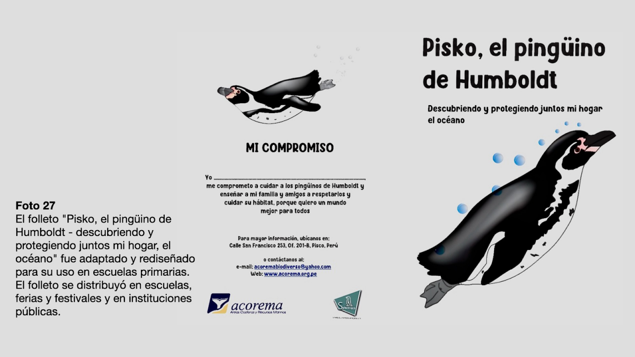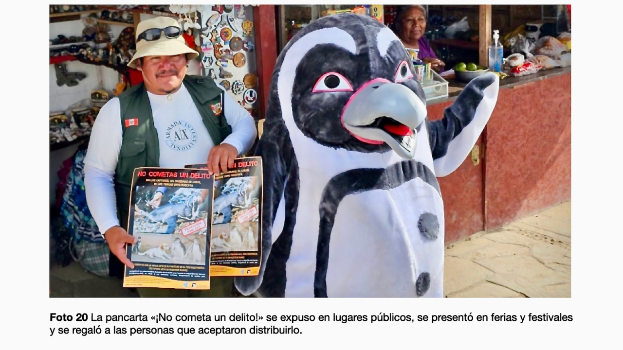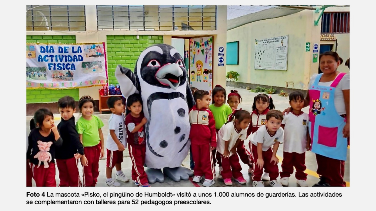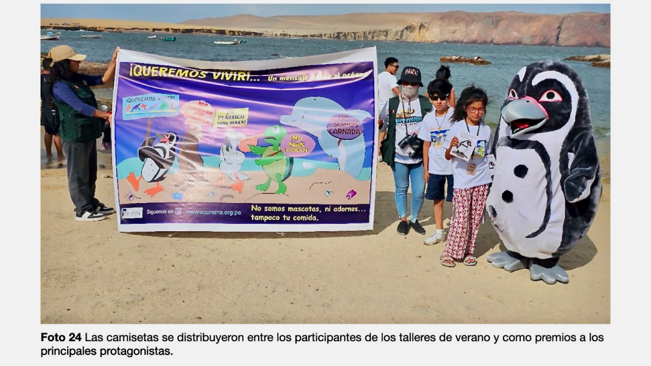 Durante el periodo del informe, se celebraron 25 talleres en siete colegios en las provincias de Pisco, Chincha, Nazca, Ica y Lima para proporcionar información sobre la biología, las amenazas y la protección del pingüino de Humboldt y de su hábitat. Se atendió a unos 2.500 alumnos y unos 70 profesores de primaria y secundaria. Al final de los talleres, se animó a los alumnos a participar activamente en la protección del pingüino de Humboldt y su hábitat con cartones, dibujos, exposiciones y vídeos. Las demás actividades, desde los murales (apartado 2.2 del informe) hasta los numerosos materiales (apartado 2.7 del informe), se ilustran y explican en las fotos 3 a 27.