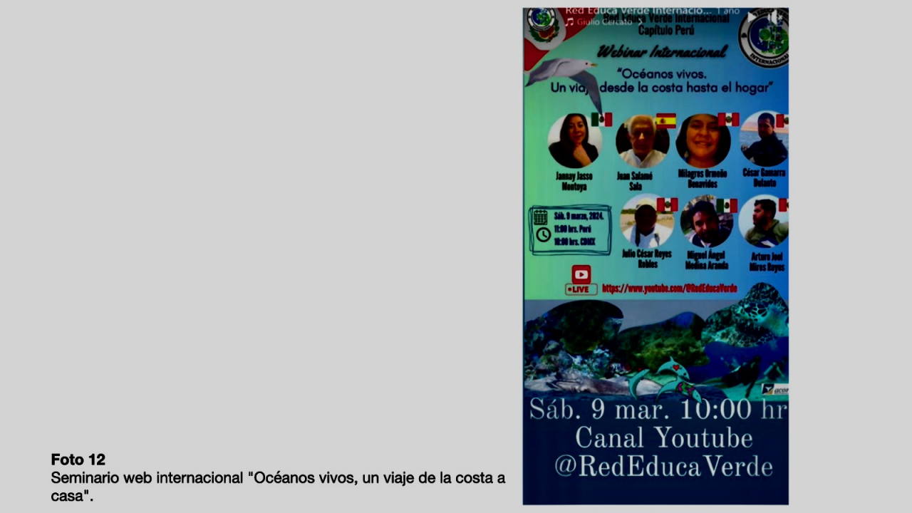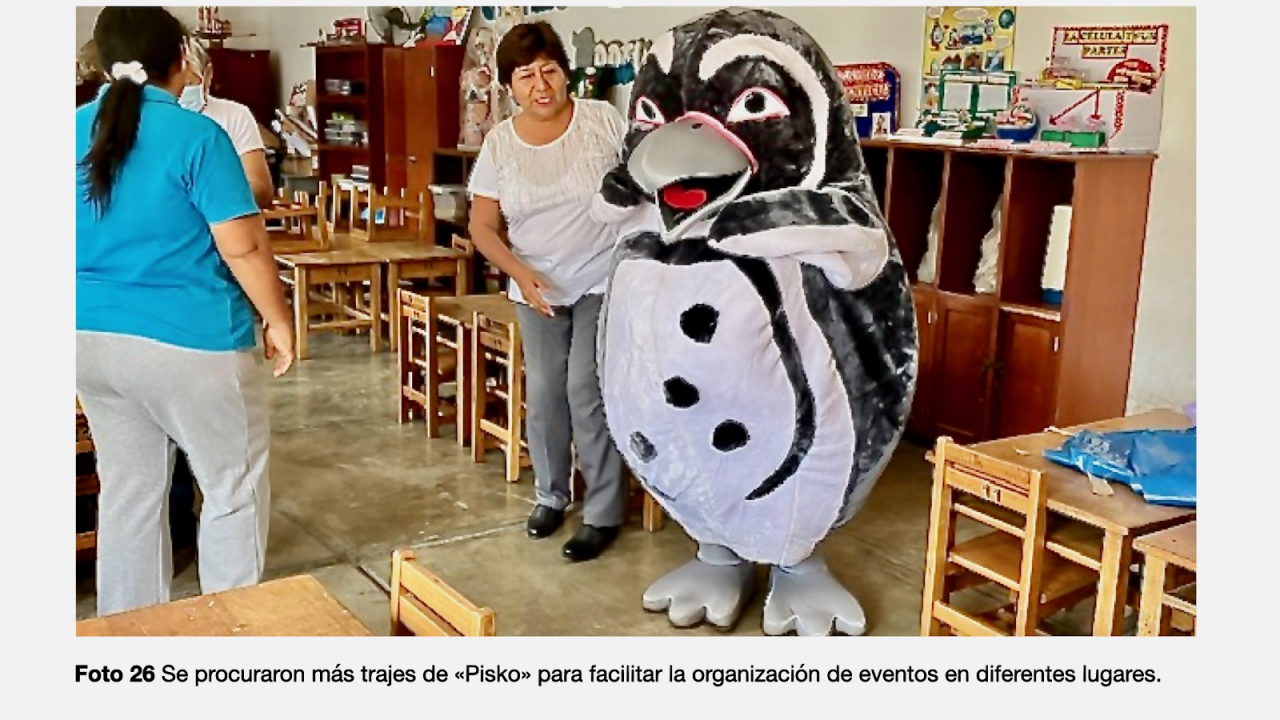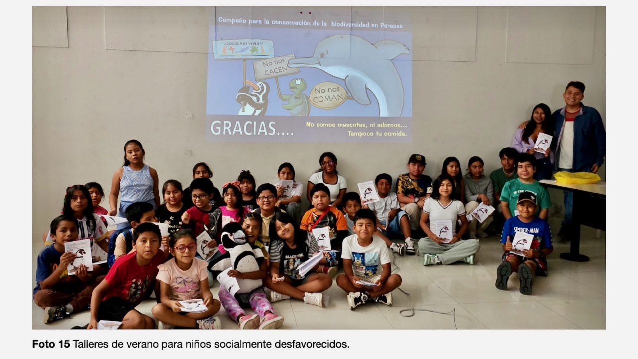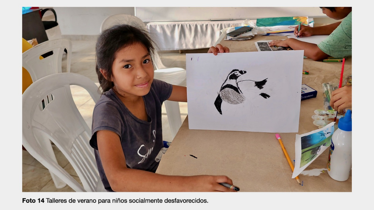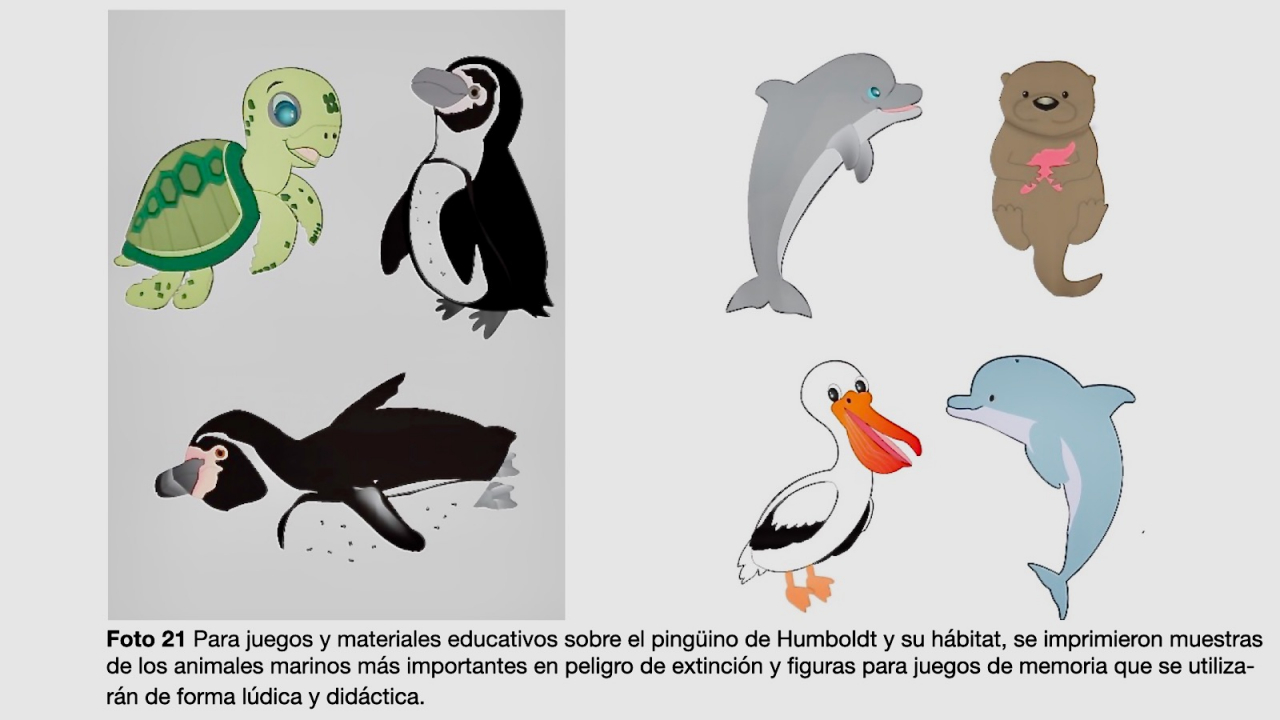 Durante el periodo del informe, se celebraron 25 talleres en siete colegios en las provincias de Pisco, Chincha, Nazca, Ica y Lima para proporcionar información sobre la biología, las amenazas y la protección del pingüino de Humboldt y de su hábitat. Se atendió a unos 2.500 alumnos y unos 70 profesores de primaria y secundaria. Al final de los talleres, se animó a los alumnos a participar activamente en la protección del pingüino de Humboldt y su hábitat con cartones, dibujos, exposiciones y vídeos. Las demás actividades, desde los murales (apartado 2.2 del informe) hasta los numerosos materiales (apartado 2.7 del informe), se ilustran y explican en las fotos 3 a 27.